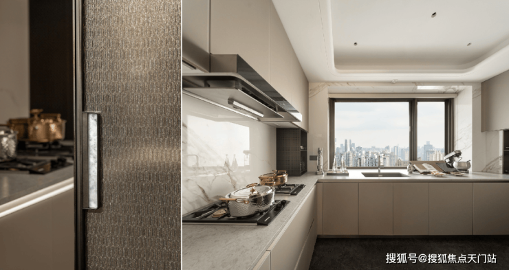 厨房内竹纹夹丝玻璃门、威乃达坡璃烤漆橱柜、与卡拉拉金大岩板台面相融,同时嘉格纳十件套满足每一种味蕾的偏好,厨房内,灶台/油烟机/洗机/冰箱(独立分体设计)五件套;向外,嘉格纳咖啡机/暖碟机/酒柜/烤箱/蒸箱等西厨五件套配置,构筑中西共融的烹饪场域。