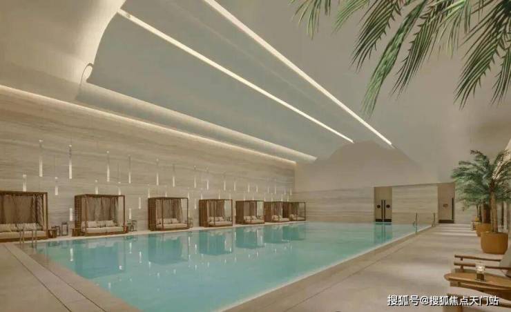 会所内的泳池上方做流畅且立体的吊顶线条,造型现代且富有层次感。这样的设计不仅提升了空间的视觉效果,更营造出一种轻松、悠闲的度假氛围。