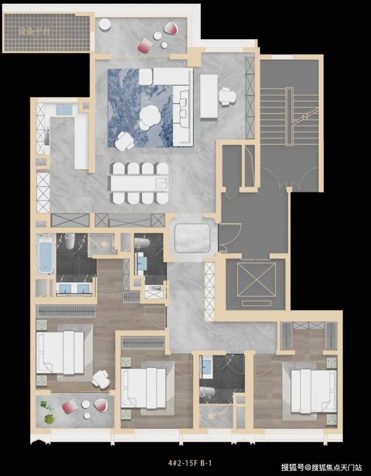 尤其 主卧星级套房 ,配置独立衣帽间、书房,奢华主卫四分离,双台盆+淋浴区+大浴缸+智能马桶,私密性&奢适度无敌;