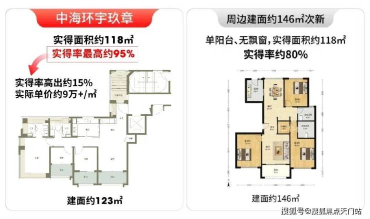 项目约123㎡户型,实得率最高约95%,而周边非新规 / 二手房实得率普遍只有约80%。