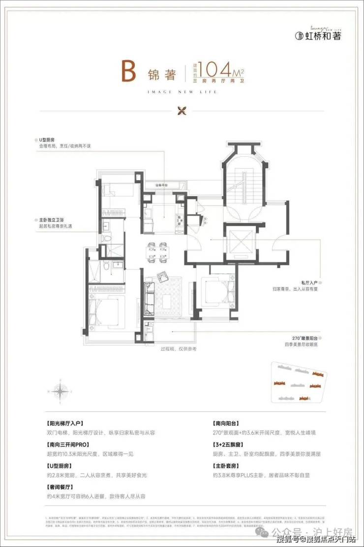 建面约104㎡舒适三房,三开间朝南+动静分区,设计水准颇高。特别是宽景阳台的设置,为客厅配备一幅iMax广角视野,多角度观赏社区美景,适配对品质有需求的首置或首改客户。