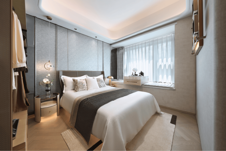 【约102㎡样板间】三房两厅两卫格局,同样的布局设计巧思应用于102㎡,打造出近乎双套房的生活体验。5米面宽横厅设计,营造极致通透感,臻选奢石融入空间,优雅时尚。厨房科学动线设计,搭配国际品牌五金和厨电,悦享精致烹饪时刻。星级主卧,独立卫浴,将空间最大程度延伸,打造舒居体验。