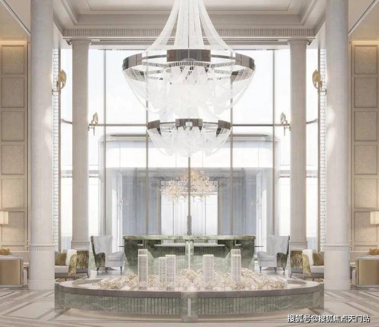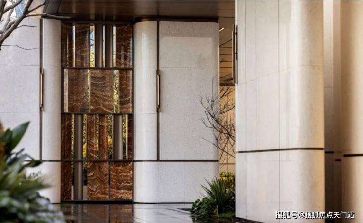 6、 社区含“奢材”量很高。门庭延街的外立面,以精工定制弧形 米色石材为主调,镶嵌典藏级 老虎玉大理石,点缀 古铜色现代海派艺术感灯器,整体呈现出百年海派的贵雅气质。