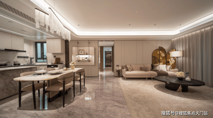 客餐厅方面, 电视背景墙采用卡慕白石材+皮革,均为交付标准;地面采用简一(或同等品牌)的 900*1800仿石砖,密拼施工,几乎看不到有任何缝隙——相信有装修经验的小伙伴一定知道,这种大砖的价格和这样的密缝工艺成本有多高!