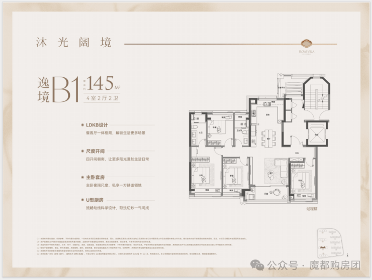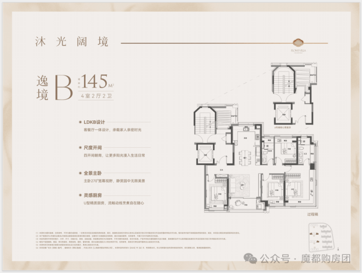 1、建面约145平户型热销且紧缺四房产品,类一梯一户设计,边套转角窗搭配超高窗墙比,采光通透,兼具功能与尺度的双重要求;