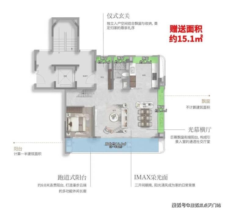 这个户型有约9.8㎡的飘窗,约7.2㎡的阳台,整体的附赠高达约13.4㎡。 这是目前上海外环沿线,是附赠率最高的一个小高层产品。