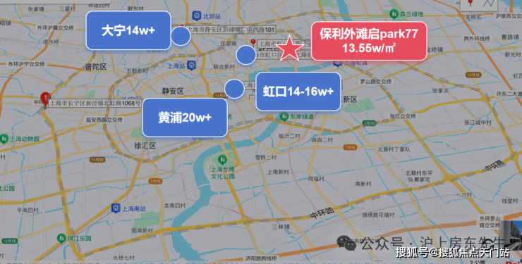 同为内环的北上海,虹口两个盘,一个14W+,一个16万+,还有黄浦目前的20w+,再拉到中环,大宁14万,长宁中环边上都已经13W+了,徐汇滨江19.5w的均价就更不用说了,反观保利外滩启park77,身处内环内却卖出了中环的价格,所以13.55w的均价怎么就贵了?