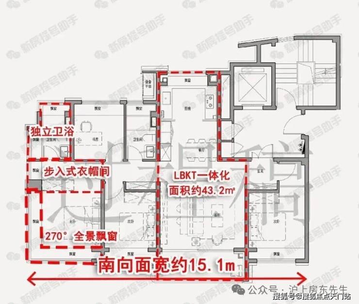 1、空间革新!四开间朝南,南向面宽高达约15.1m,采光面充足,景观视野开阔!LDKB一体化设计尺度奢阔!面积达约43.2㎡!超广阳台采光及通风效果MAX!年轻父母用嵌入式烤箱准备Brunch,老人在阳台晒太阳听鸟叫,孩子趴在腿边畅想未来~
