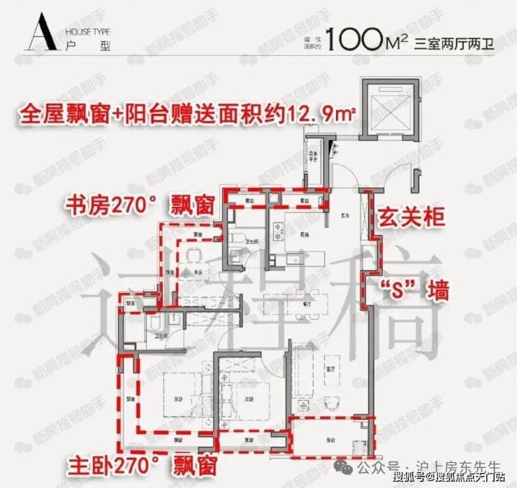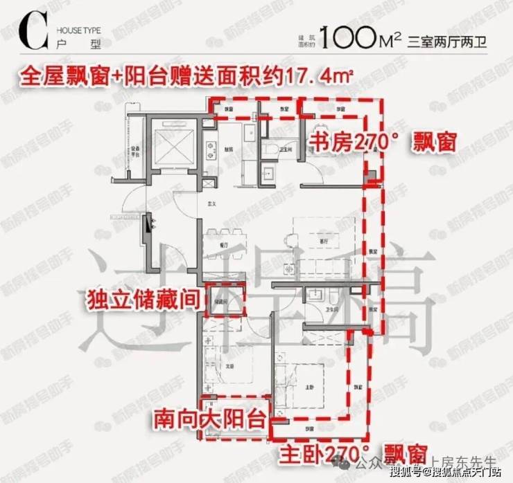 3、空间升级!超配双270°飘窗格局!市面上很少会有主卧及书房均设计270°飘窗的百平户型,稀缺性不言而喻~