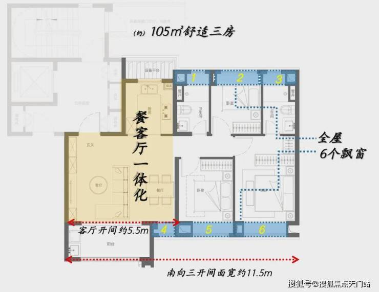 优越的窗墙比,可以最大限度将优美的景观纳入眼帘;南向三开间面宽更是达到了约11.5米,可以说市场同户型面积段产品很难做到这样极致化;功能房间以舒适度为导向服务生活,尺度均做到了当下主流产品水平之上;并且全屋附赠6处飘窗,高附加值令人心动。