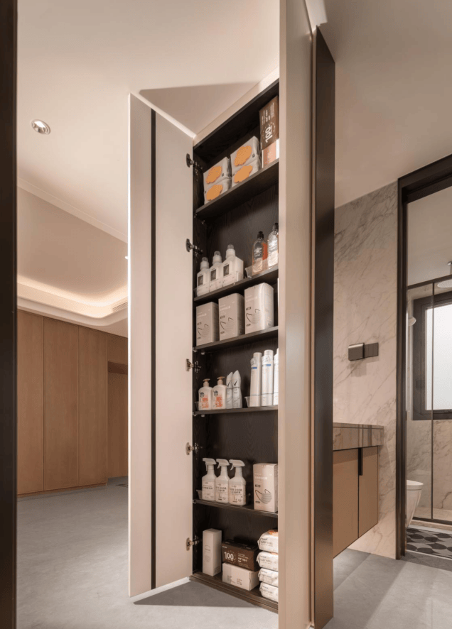 双薄柜设计则大大增加容纳空间,举例来讲,可容纳约200包纸巾,足以满足全家1年使用。而洞洞板设计,则可收纳清洁工具、长柄伞等大件日常用品,如此贴心布局,保证室内物品足够井然有序,也更为利于家庭日常打扫。