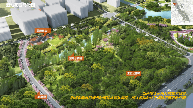 这座南三林片区的中央公园,划分为: 湿地花园区、鸣湖共享区、林荫跃动区和社邻园艺区,四大功能分区。嵌入人性化和生态化的设施,激活场地引人入园,构建市民休闲化的游憩绿地。