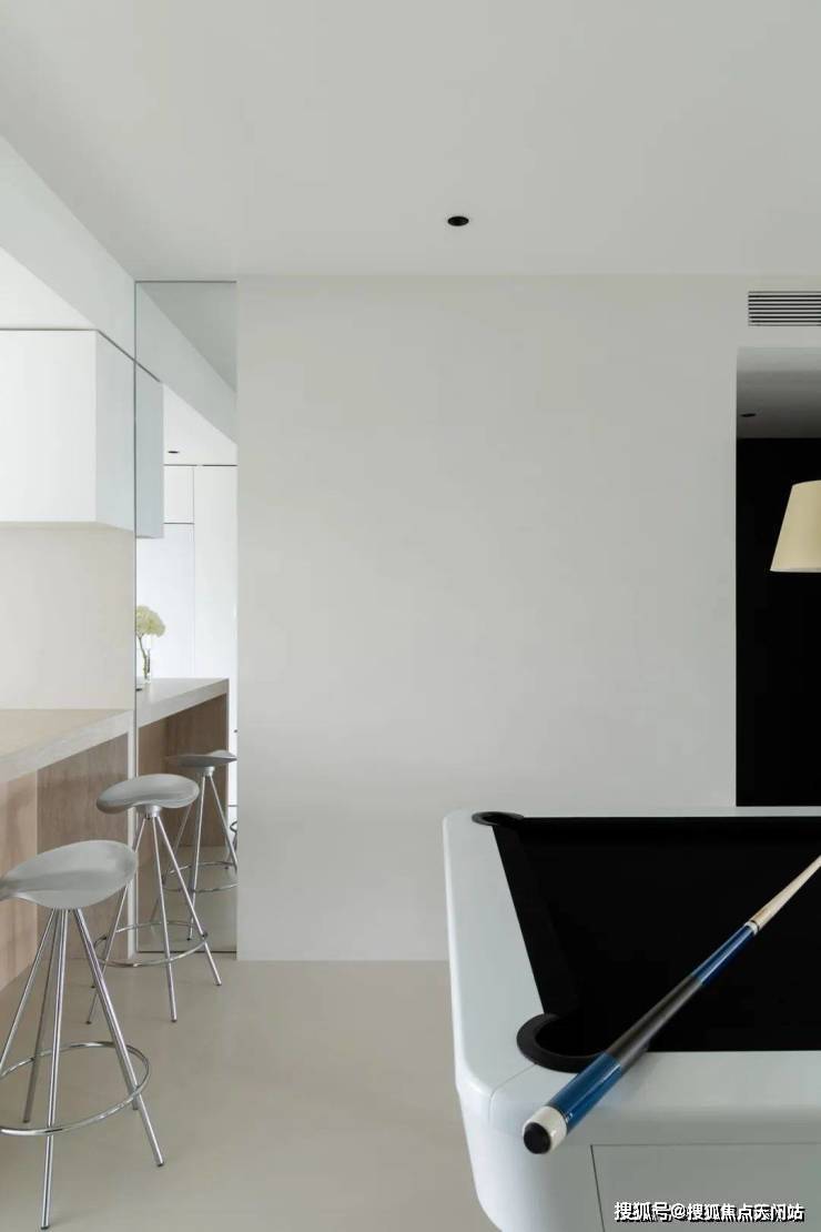 厨房操作平台的横向延展催生出社交属性的介入,使空间在功能置换中获得新的定义。传统餐饮概念在此被解构,通过台球桌的跨界演绎,将休闲与餐厨的日常起居相互渗透,注入个性化的趣味体验。