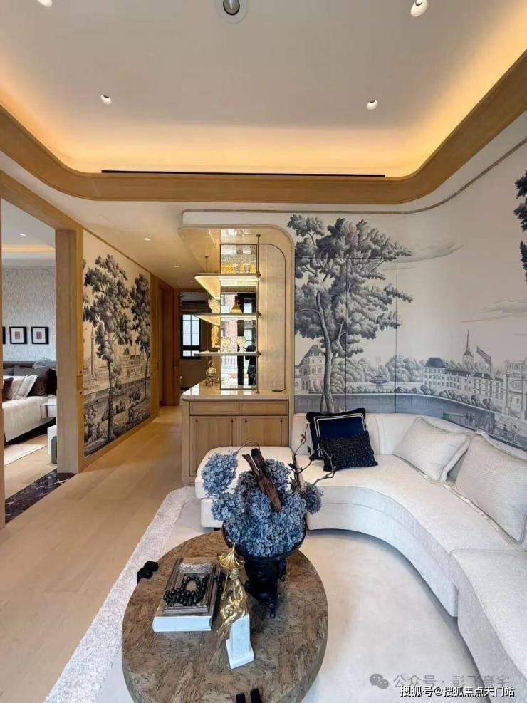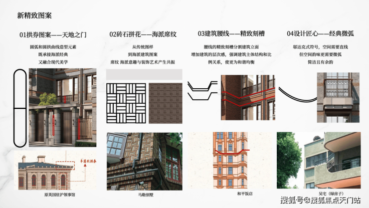 复刻马勒别墅的海派席纹砖石拼花,雕琢顶豪别墅的气场。天地之门拱券图案、精致刻槽建筑腰线、邬达克式经典微弧,勾勒风貌别墅的新精致主义格调。