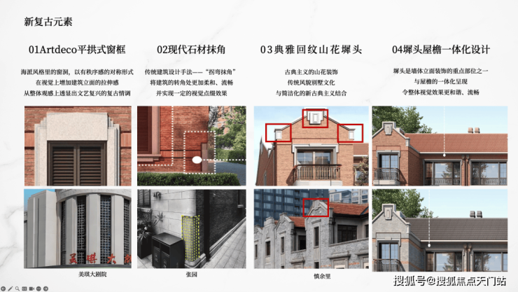 源自石库门鼻祖张园的灵感,提取现代石材抹角的新复古元素。同时凝萃Artdeco平拱式窗框、经典回纹山花墀头、墀头屋檐一体化设计,擘画风貌别墅的新复古主义风情。