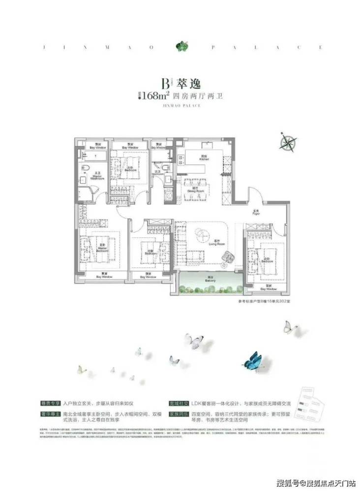 四开间朝南的设计,户型方正、标准的南北通透设计;阳台+客餐厅+厨房一线相连,整个户型的采光通透度、通风都非常出众。4房6飘窗1阳台的设计,各个功能间面积分配合理,可以说是上海千万级置业的优选!