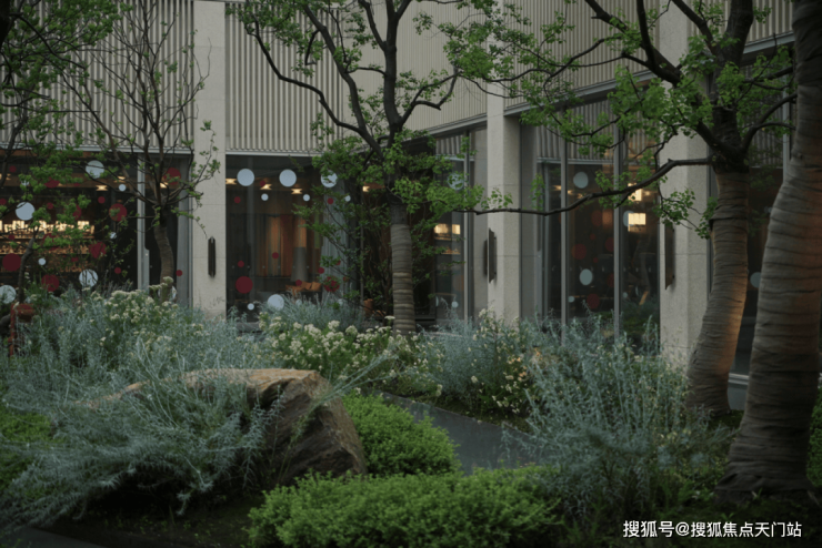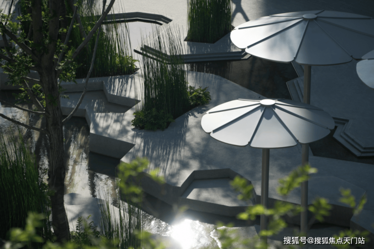 步入社区,首入眼帘的是约 6米高水幕的下沉式山水庭院 ,与周围建筑融为一体,将自然与松弛感带给社区。