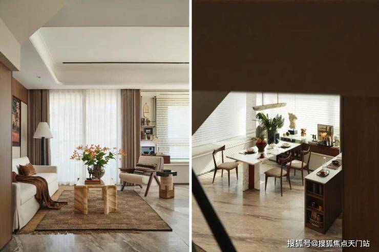 客餐厅空间面宽达到6.3米,配备270°飘窗+宽景阳台,大大提高了居住的调性和空间视野,社交主场在阔绰客厅中尽显体面。