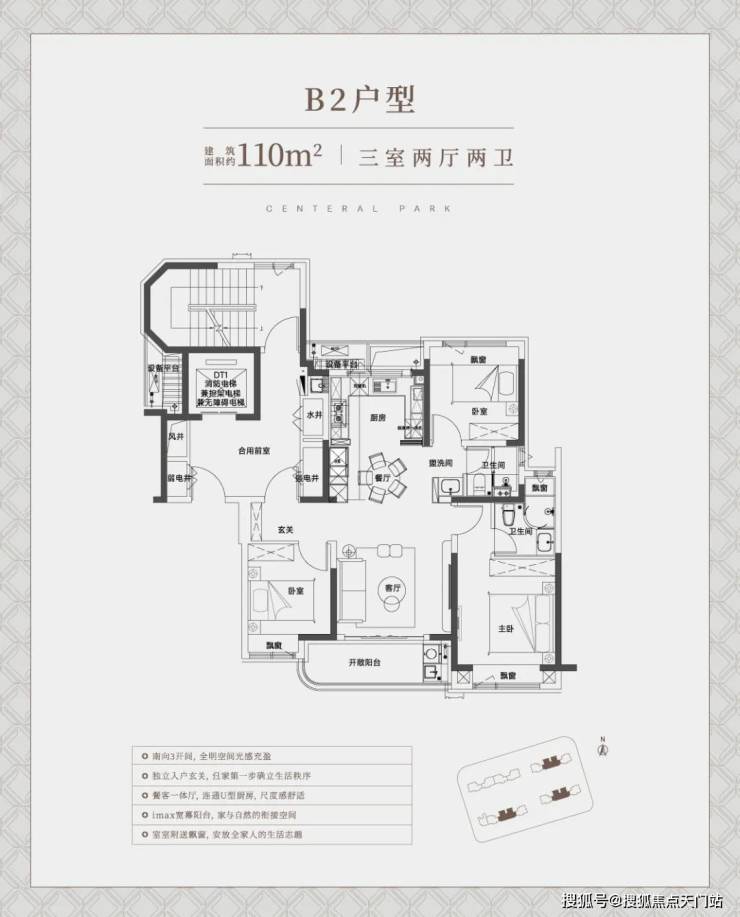 建面约110㎡中间套竖厅户型 ,同样也是标准的 南北通透飞机户型 ,整体室内的采光、尺度感、通风都相当出色。非常适合一家三口、年轻夫妻的全生命周期需求!