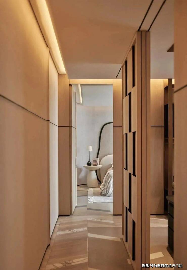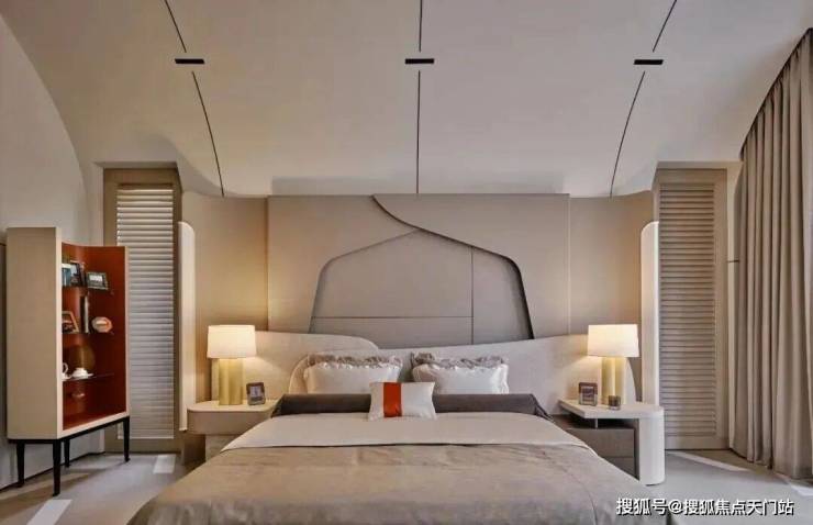 顶层专属于主卧,推开双开门,拱形天花设计尽显浪漫,挑高至3.8米,一条长灯带自浴室贯穿至整个卧房,分置于灯带两侧的弧形结构,环抱出一份安心。而其床头背板也被设计成拥抱的视效,为空间增添温暖包裹的氛围。