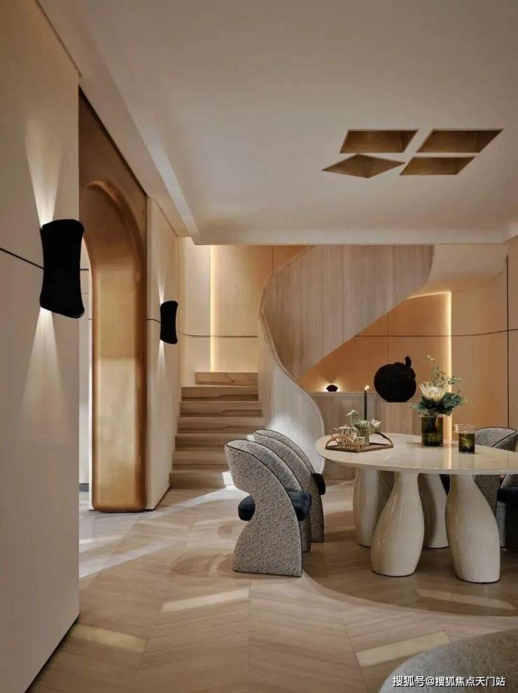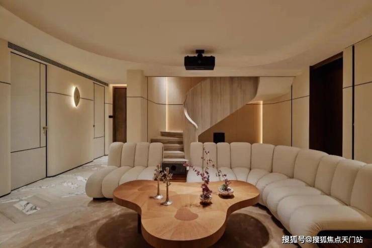 顺着弧形木质楼梯抵达地下空间,仿佛游走在一曲流动的乐章中。一切都共同呼应着水的特质,传递着低调隐逸情怀与圆融个性。
