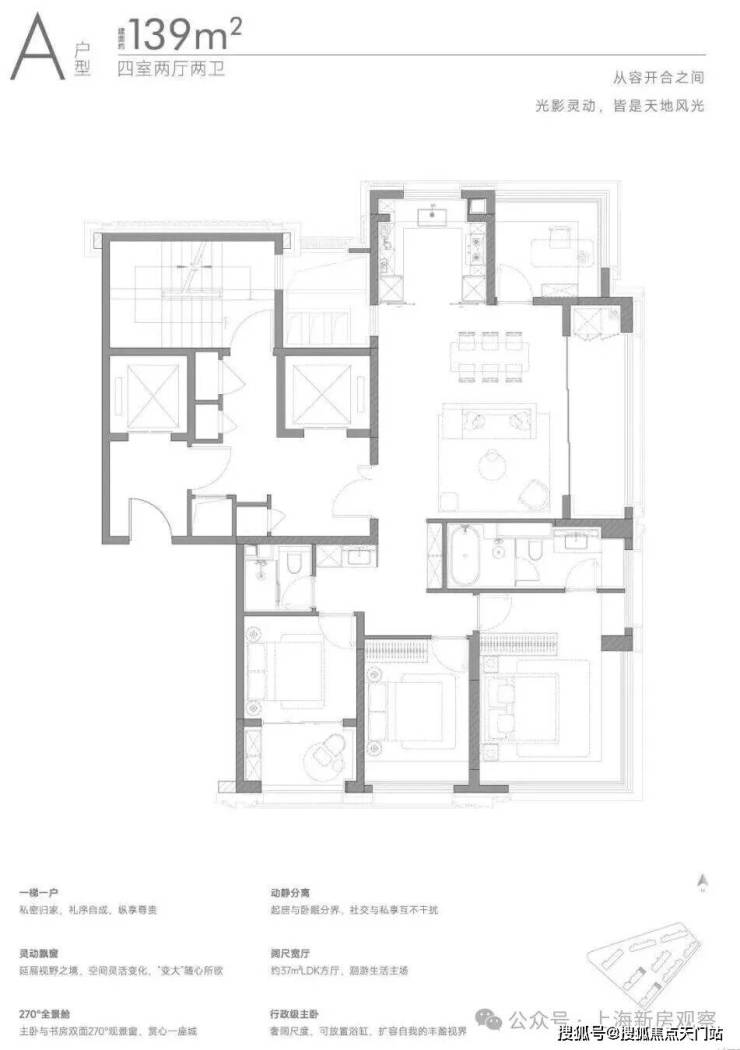 部分楼栋设有架空层,社区设置下沉式庭院、泳池会所,并配建部分社区配套与公共租赁住房。产品上也引入270°转角玻璃、双阳台、N+1灵动空间等设计。