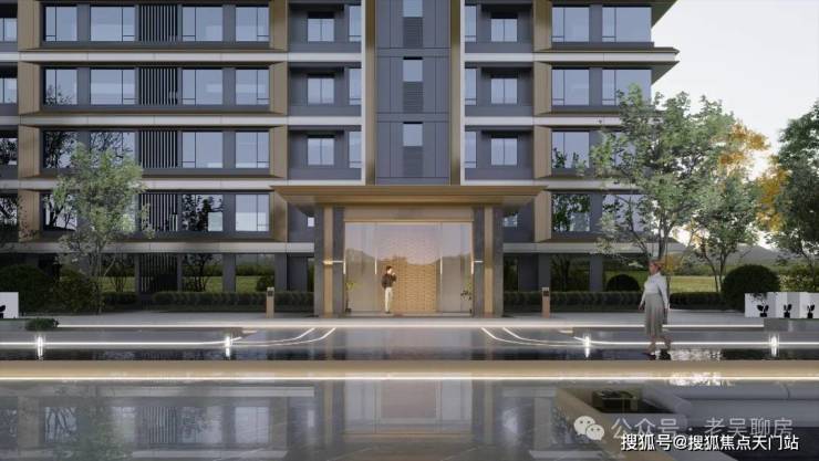 外立面方面,项目汲取广富林文化精髓再造东方屋宇, 采用渐暖色石材、银灰色及香槟色铝板和涂料的组合,带来厚重与轻盈的平衡,在彰显文化豪宅的同时又包含国际风骨,整体呈现诗意东方之美。
