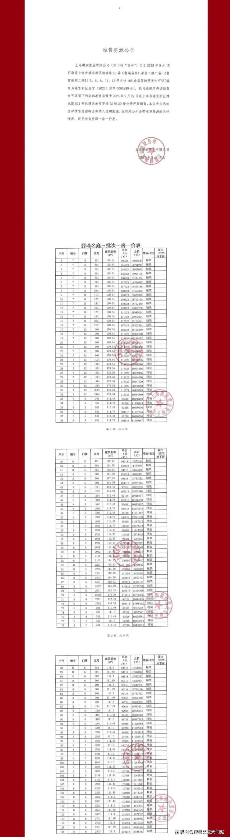 上期一房一价表如下: