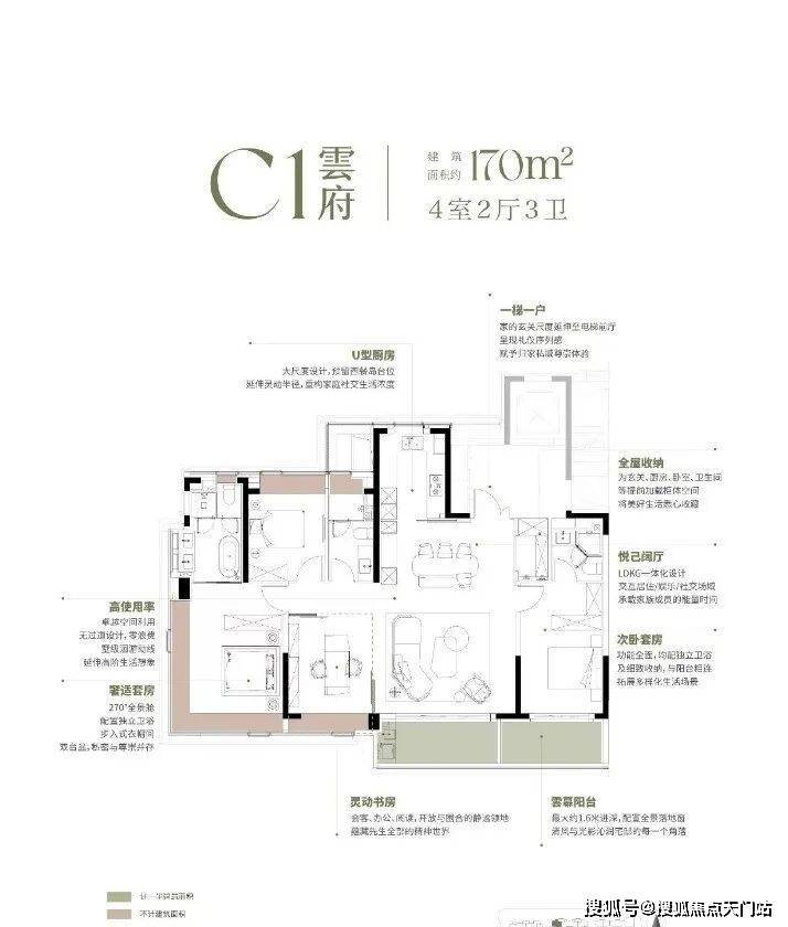 随后推出的 170㎡“悬浮全景舱”,直接引领上海高端户型革新—— 南向 15.8 米四面宽让每个空间都享阳光平权,深 U 型厨房预留西厨岛台,约8.35 米双阳台兼顾功能与情绪价值,双套房 + 270° 全景窗 + 三卫设计,更将 “新平权主义” 落到实处,让每位家庭成员都有私密空间;