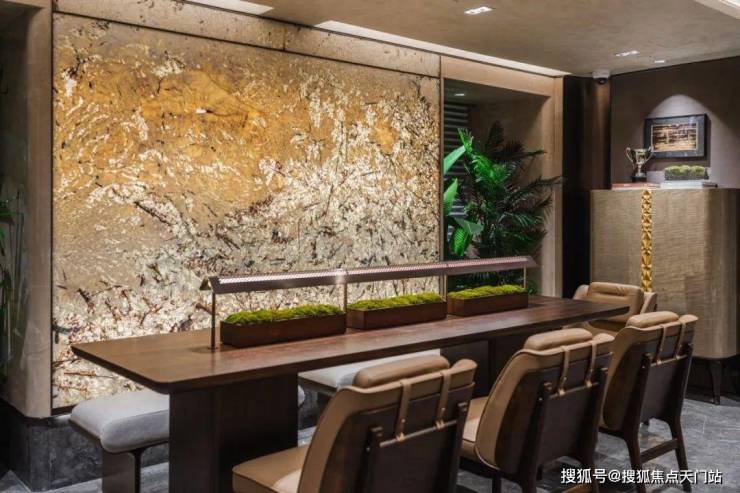 精致的迎宾水景、苍劲滴翠的罗汉松,为城市的界面,增添一抹亮色,也让当代年轻人,在享受现代都市生活的同时,感受到家的温暖和亲切。蓝翡翠的奢石,以深邃幽远的尊蓝色基底,尽显光彩下的神秘奢华;而顶部异形的仿铜星空顶设计,用香槟金色斜角造型铝板搭配熠熠灯光,碰撞出科技与艺术的美学。