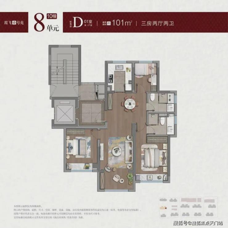 约 101㎡三房户型“独立电梯厅 + 专属玄关” 设计,拥有约 6㎡私属入户空间,可定制鞋帽柜、艺术品陈列区或临时社交角。