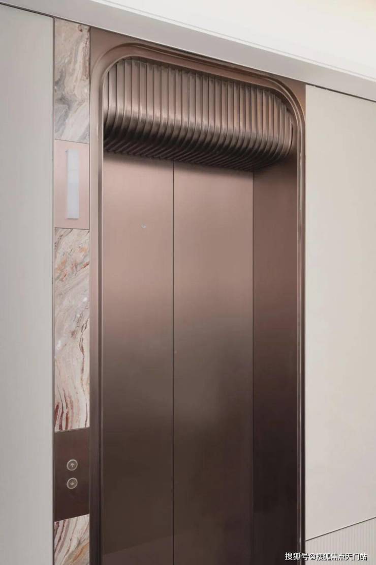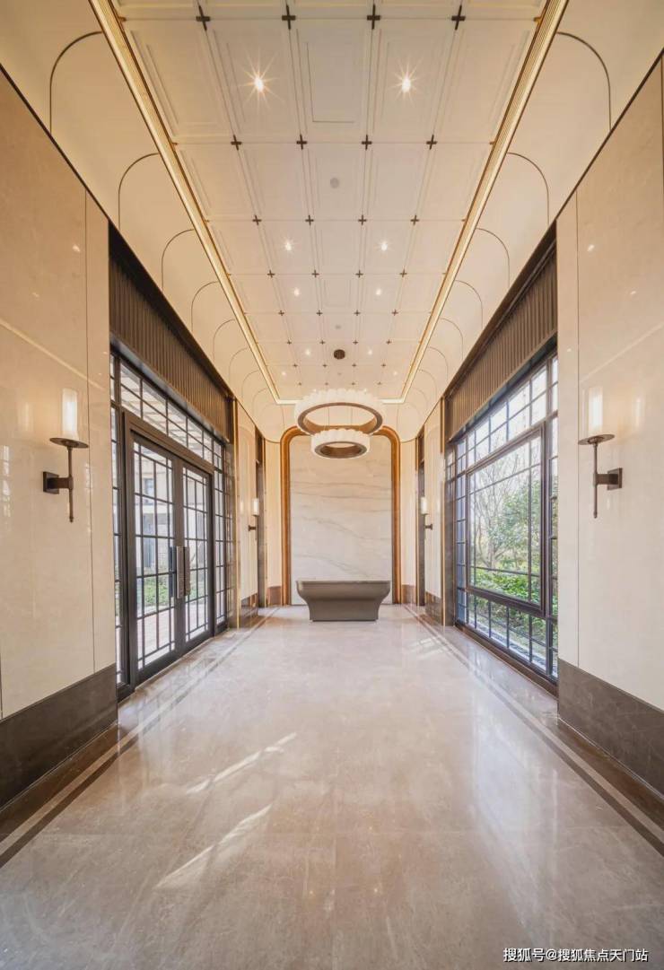 :南入户大堂约 6.2 米挑高穹顶,以夸张的弧形造型搭配棋盘格吊顶,石材拼接均匀如镜面,金属线条与石材纹路形成 “方圆之境”,归家仪式感拉满;