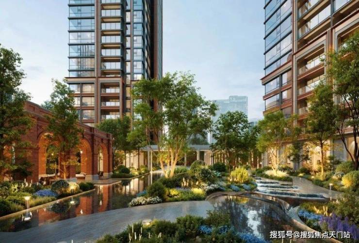 社区景观上,突破市区项目常见的「兵列树阵式」布局,通过建筑楼体的精密偏转,形成罕见的围合式社区形态。