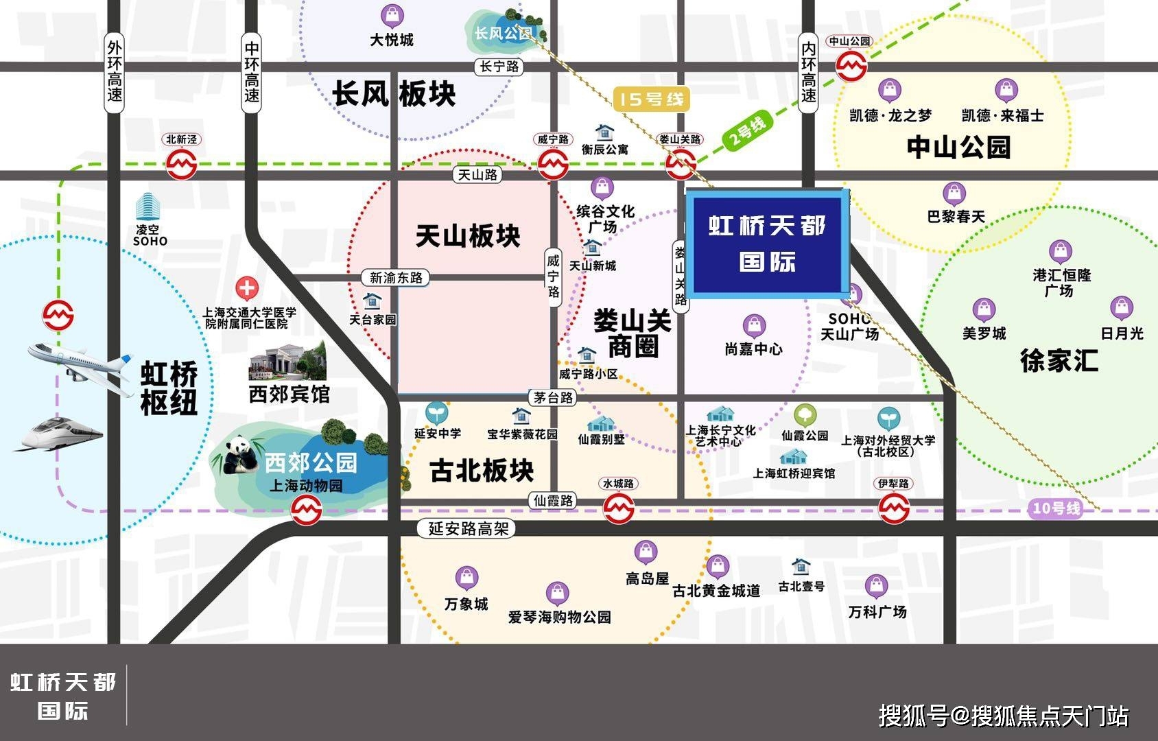板块价值:虹桥天都国际位于长宁区 · 中山公园板块,在上海西部从南到北一系列的商圈中,中山公园是一个居中的位置,又因为它的轨道交通的枢纽关系,因此来说的它其实是上海西部的一个枢纽,并且还会继续担当一个枢纽的作用。