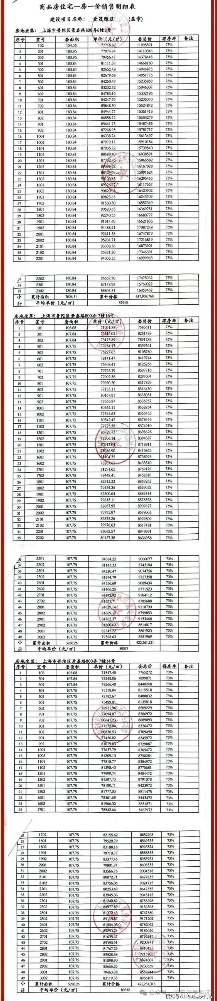 普陀金茂府一房一价表