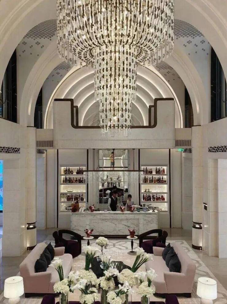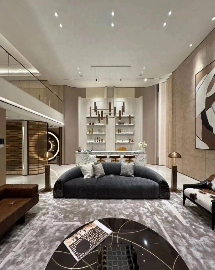 高定公区,重塑海派归家史诗;隐奢门庭:社区大门以古琦黑奢石手工锻造弧形幕墙,将珠宝镶嵌工艺融入建筑肌理;