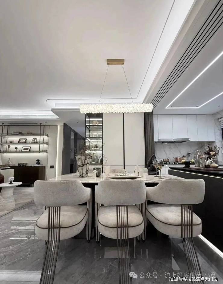 进到实地约99平样板房,整个玄关柜几乎全部都是皮质缝线包裹,细节拉满;
