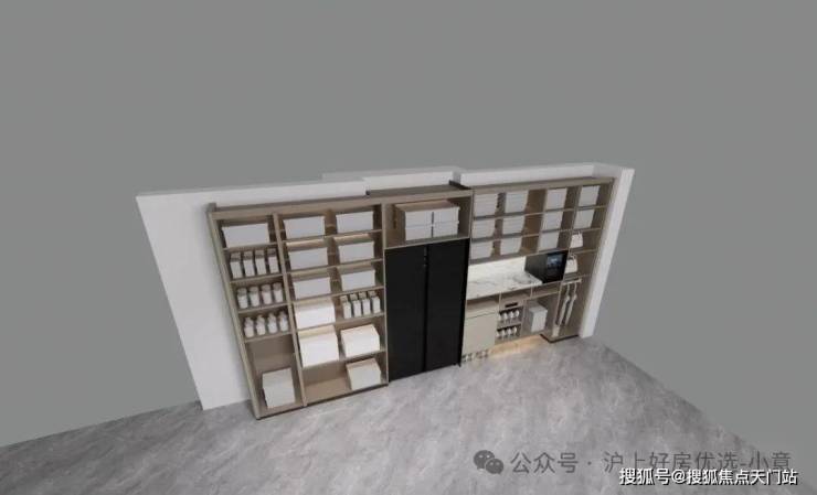 通过示意图我们会看到,一般项目的玄关柜处于成本原因只会做到下图中间位置的冰箱位置就结束,而外滩源著在标配的双开门冰箱(小户型博世或同等品牌、大户型利勃海尔或同等品牌)左侧还额外交付有完整的储物空间: