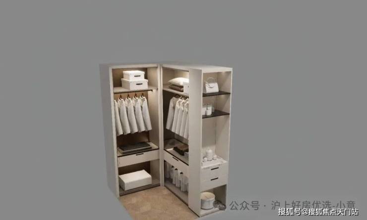主卧和约99平户型一样,衣柜更大形成衣帽空间,还交付有半开放式、类似于酒店的迷你吧设计: