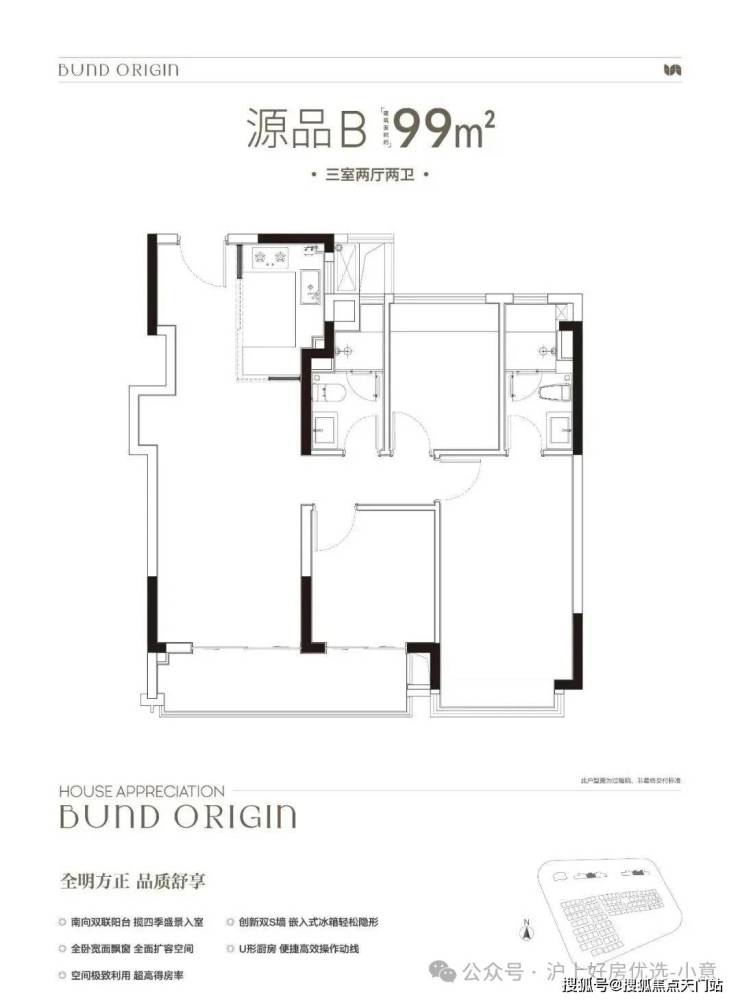 建面约99㎡3房2厅2卫,非常标准的动静分离、三开间朝南户型。