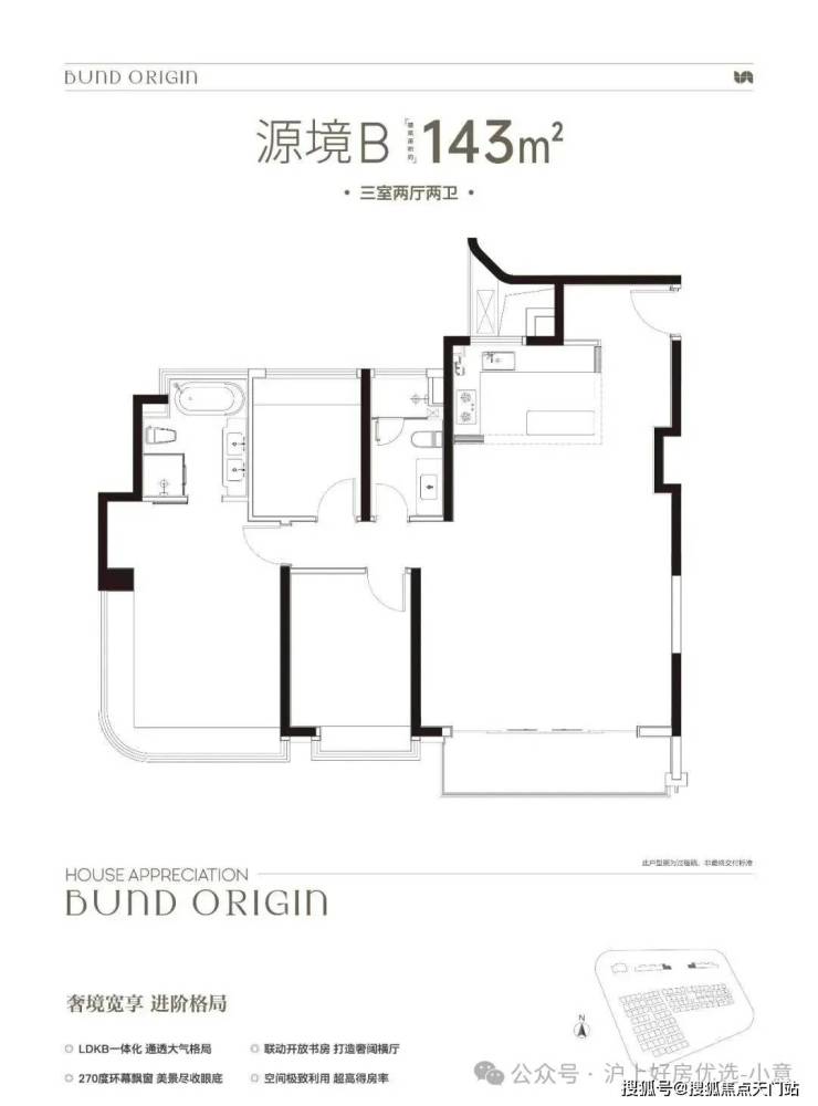 B户型是3房2厅2卫格局, 三开间朝南+LDKB一体化+奢阔宽厅+全卧室带飘窗+主卧套房设计+动静分离+主卧270度飘窗,舒适度更高。