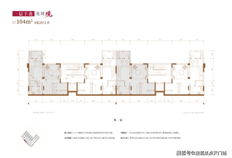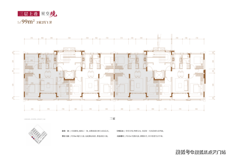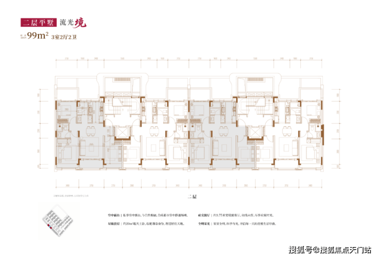 从内部空间体系来看,地上三层,层高分别是3.6米、3.3米和3.3米;每个单元一梯两户,每户均拥有类独立电梯厅;一楼带地下室及庭院,并通过创新退台式设计为二楼和三楼打造私家空中花园,形成户户有花园的墅居生活方式。