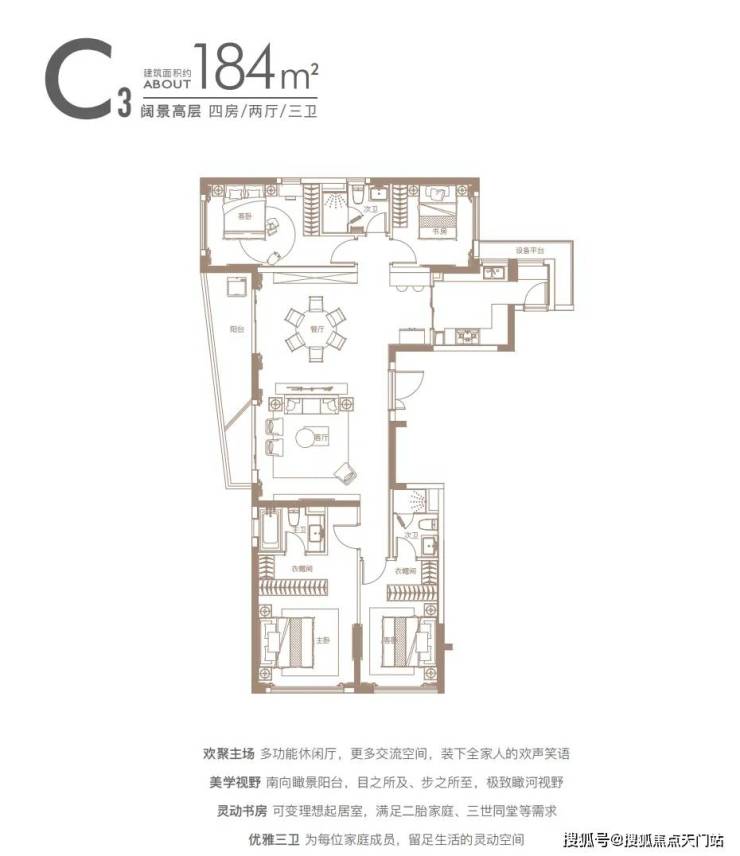餐客厅阳台一线贯通,动线流畅,弧形阳台拓展景观视野。