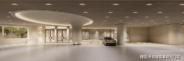 底部以石材和金属结合的曲线异形巨柱抬高建筑体量,构筑了廊柱与动态景观空间,既满足了尊贵的入户大堂需求,又释放了底层空间的潜力,进一步提升了低层住宅的采光效果和视野范围,从而营造出更为宜人的居住环境。