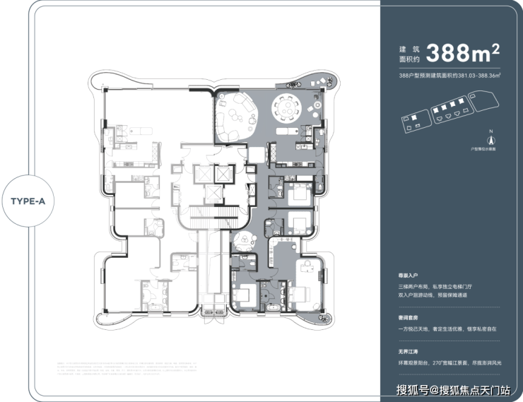 在售房源及约总价:建面约 180㎡三房(总价约 3240 万起)、240㎡四房(总价约 4320 万起)、278㎡四房、388㎡江景大平层(总价约 7000 万起)