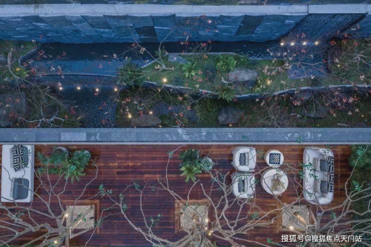 向上,则是整座溪谷的观景逸闲之处——【悬浮茶室】,它凌于山川溪谷之上,收纳庭院的万千水意,搭配巴西高山流水石桌面,于此静憩,自得静心。