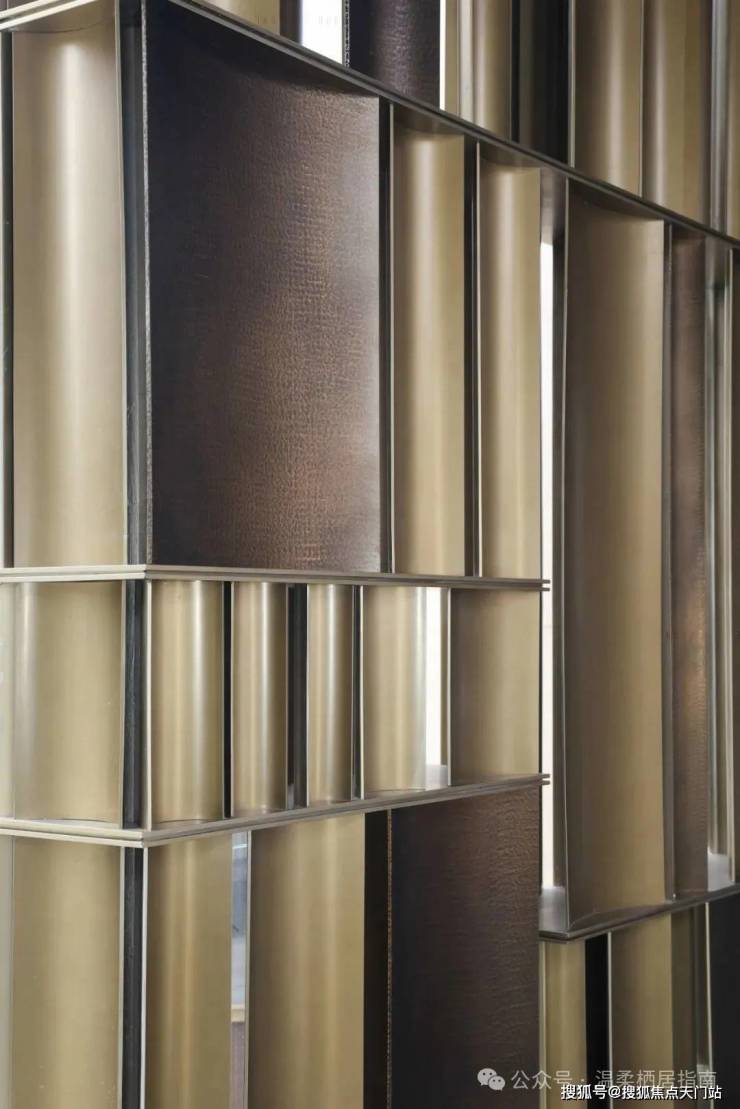 一块游廊上的锤纹铜板深深打动了我,锤纹最早源于金银铜器的加工,“手落为一锤 四锤为一纹” ,这块铜板需要通过匠人千百次的手工捶打才能形成阡陌纵横的纹路变化 。这样的手工慢艺,在招商序的会所之中不止一处,在如今机械化模板化的时代之下,这份用心实为珍贵。