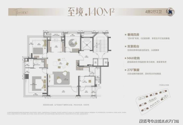 约140㎡户型采用经典“四叶草”布局,四个卧室分布在四个角落,家庭活动核心居中——私密性高、空间零浪费、通风采光好,多口之家互不干扰。