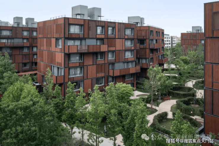 沁风雅苑的产品设计贯彻“去繁至简”的理念,建筑立面采用优雅木色调搭配竖条木纹,呈现极简主义的建筑艺术。六层叠加产品错落分布在18个院落之间,呈倾斜镜像状排列,让建筑融入园林之中。