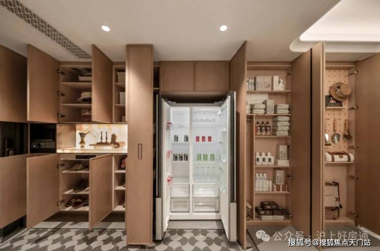 比如入户部分的玄关柜、墙柜、餐边柜等,都做了整排一体化。前期同样使用大受好评的S墙设计依旧得到延续,冰箱可以平整嵌入,大方美观。